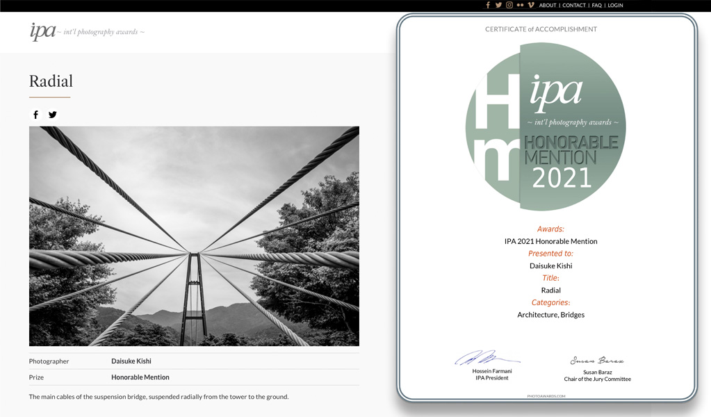 IPA 2021 October 27, 2021 “Radial” | Honorable Mention | Category : Architecture – Bridges Proudly part of outstanding collection selected among a total of nearly 14,000 entries from more than 100 countries around the world @ International Photography Awards 2021. Previous articleJTPA 2021Next article PX3 2022